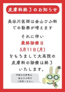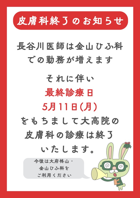 それに伴い最終診療日5月11日(月)をもちまして大高院の皮膚科診療は終了いたします。