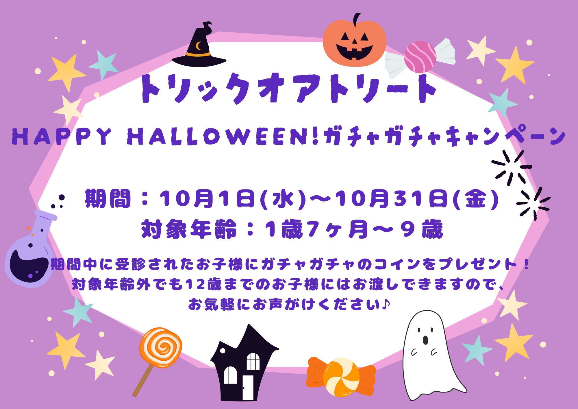 新着情報(詳細) R7年10月ガチャイベント (2025-09-22) 10月も引き続きガチャイベントを開催します♪期間:10月1日(水)〜10月31日(金)対象:1歳7ヶ月〜9歳のイベント期間中に受診されたお子様(対象年齢でなくても12歳までのお子様にはプレゼント致します。ご希望があれば気軽にお声掛けください♪) 一覧へ戻る