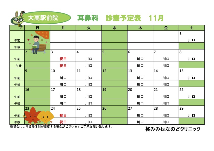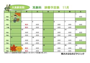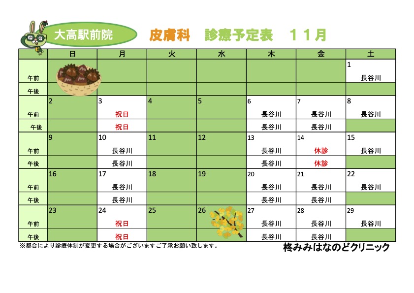 新着情報(詳細) R7年11月診療予定表 (2025-10-16) 11月の診療予定表です。ご参考になさってください。【耳鼻科】【皮膚科】 14日(金)の診療は医師の都合により休診となります。 一覧へ戻る