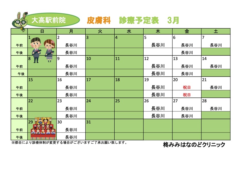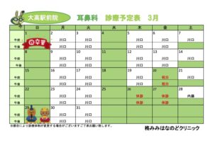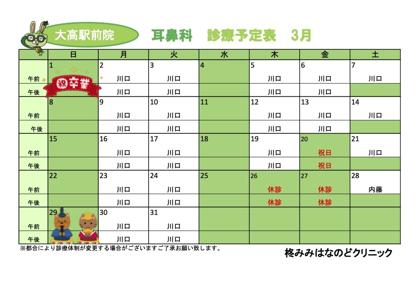新着情報(詳細) R8.3月診療予定表 (2026-02-11) 3月の診療予定表です。ご参考になさってください。3月26日(木)・3月27日(金)の耳鼻科は医師の都合により休診でございます。3月28日(土)は内藤理事長が代診を行います。院長の休診に伴い休診日前後のお日にちは混雑が予想されます。お時間に余裕をもってご来院ください。【耳鼻科】【皮膚科】 一覧へ戻る